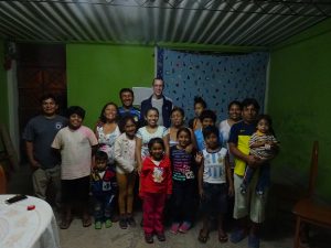 Kyrklokalen kunde vi inte komma in i. Den saknade sedan en tid elektricitet. Istället samlades vi i ett hem. 8 vuxna, 11 barn + Henrik Andersson och jag samlades för sång, bibelstudium och bön. Och det tände till! Jag upplevde att de verkligen hade längtat efter att få samlas runt Guds Ord och bön. Vi avslutade med att böja knä vid våra stolar och be till Herren om hjälp med olika saker – sjukdom m.m. men också att Gud ska sända nya skördearbetare till Cerropon. Någon av medlemmarna beskrev gruppen som “förlorade får”, som behövde samlas igen.