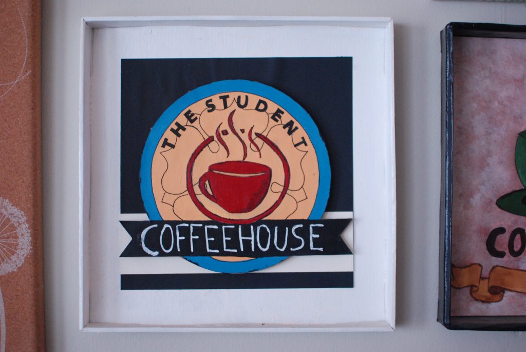 Föregående bild Nästa bild DSC_8002 Cafeéts namn är ”The student coffeehouse” . Här ser man dess loga. Tittar man noga ser man lutherrosen bakom kaffekoppen.