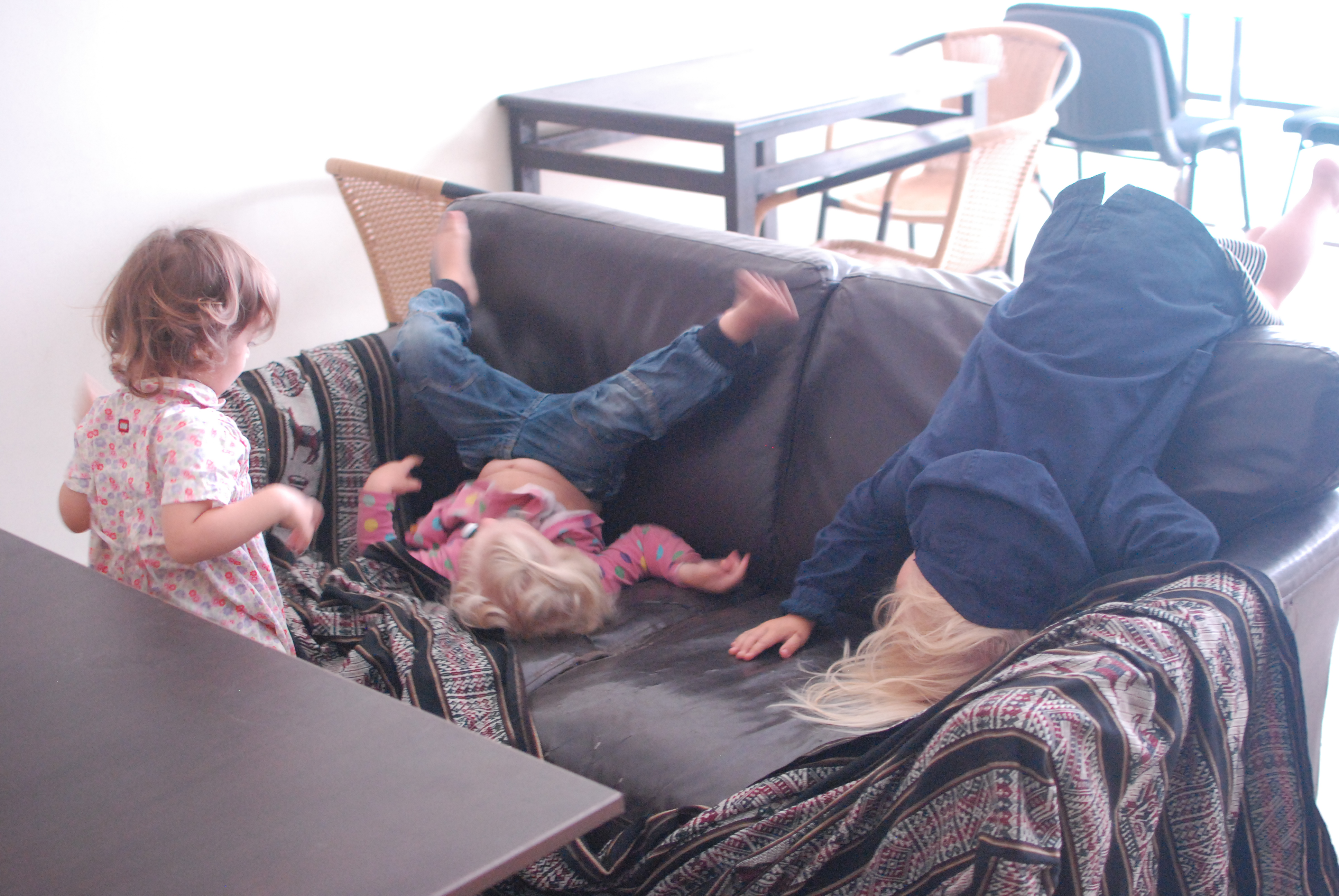 Flickorna hänger i cafeéts soffor.