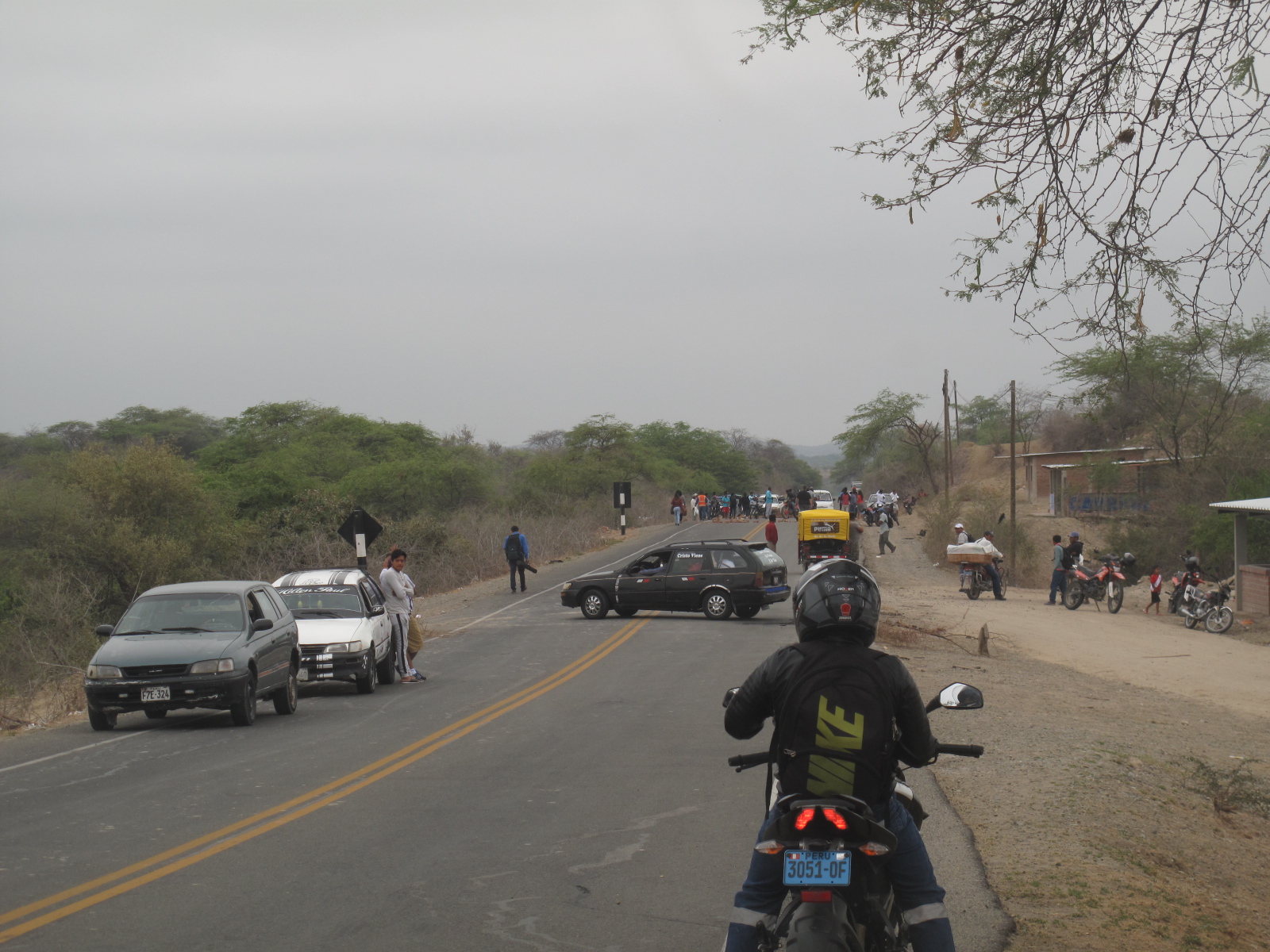 Efter ca två timmars bilresa norrut möttes vi av en blockad av människor på vägbanan. Det var bönder som hindrade alla passerande (förutom fotgängare) för att protestera mot det låga priset på mango. Med en primitiv infrastruktur innebar detta för oss att vi behövde ta den andra vägen in till Ecuador, en omväg på drygt en och halv timme.