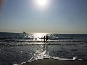 På lördagen hängde vi en del i poolen. Jag och Thea hade bland annat en livräddningslektion. Vi passade på att checka av det från innehållet i ”Idrott och hälsa åk 7”. Därefter badade jag och Håkan i havet. Den här gången väntade vi tills eftermiddagen då tidvattnet stigit och risken för rock-attacker är mindre. Det kändes viktigt att våga gå i vattnet igen. Dock blev jag på nytt chockad över hur salt det är här i jämförelse med Sverige.