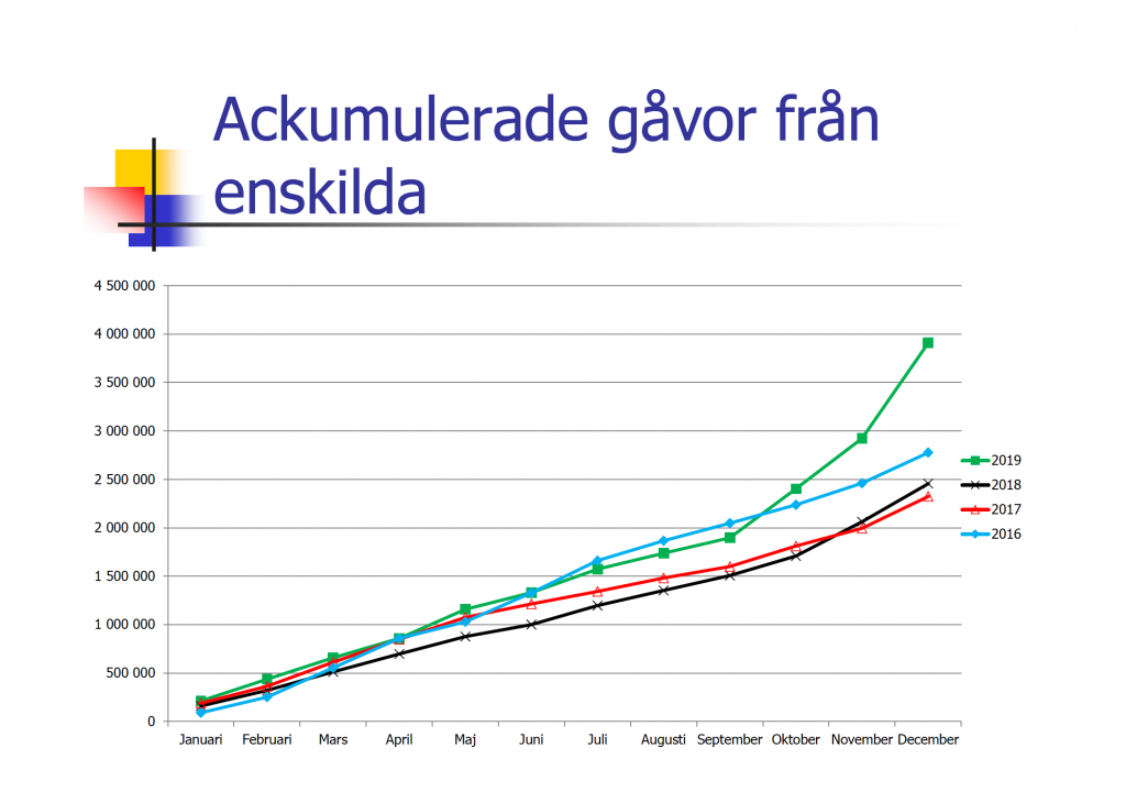 – På det två bilderna nedan kan man se dels de ackumulerade gåvorna från enskilda, dels det ackumulerade resultatet. Man ska särskilt hålla ögonen på den gröna linjen som representerar 2019. Vad gäller resultaten är testamenten exkluderade. Både 2018 och 2016 fick vi stora testamenten vilket gjorde att vi klarade oss omkring +/- 0 vid årets slut.