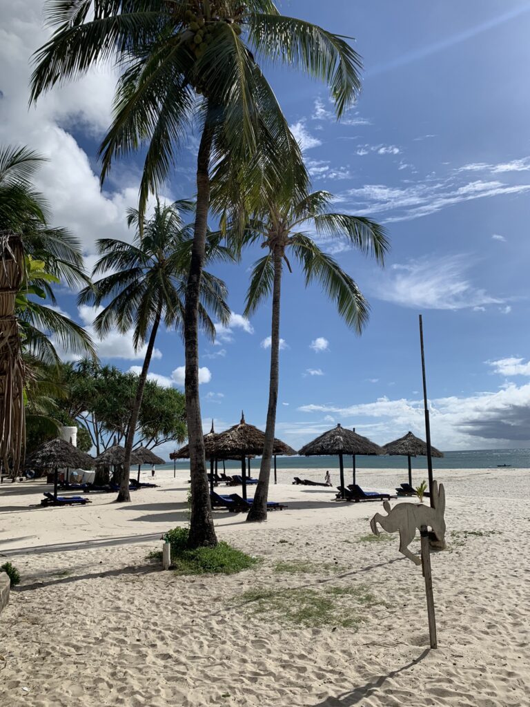 Tåget i sig var väldigt fint och likt sådana i västvärlden, men det var betydligt mer påfrestande än vi trott att få till lite sömn i den kvalmiga luften och de obekväma sätena. 03:30 var vi framme i Mombasa, förstörda av sömnbrist, och däckade på några bänkar på stationen i väntan på soluppgång. Så småningom blev vi utkastade men hittade en bil som kunde ta oss ut ur staden via färja, och söderut till Diani Beach.
