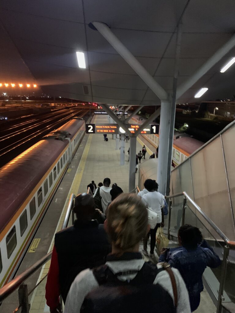 Matatun/bussen körde oss till huvudstaden Nairobi. Vi tog oss till SGRs tågstation, där säkerheten närmast kan liknas vid den på en flygplats. Vi visiterades, våra väskor åkte genom otaliga röntgenapparater och narkotika- och sprängmedelshundar skulle examinera allt. Terrorismhotet i Kenya är väldigt högt. Vi kom in på stationen några timmar innan avgång för att slippa vistas ute i mörkret, och väntade på vårt tåg. Vi tänkte nämligen att det var en bra idé att välja nattåg, något vi senare skulle ångra…