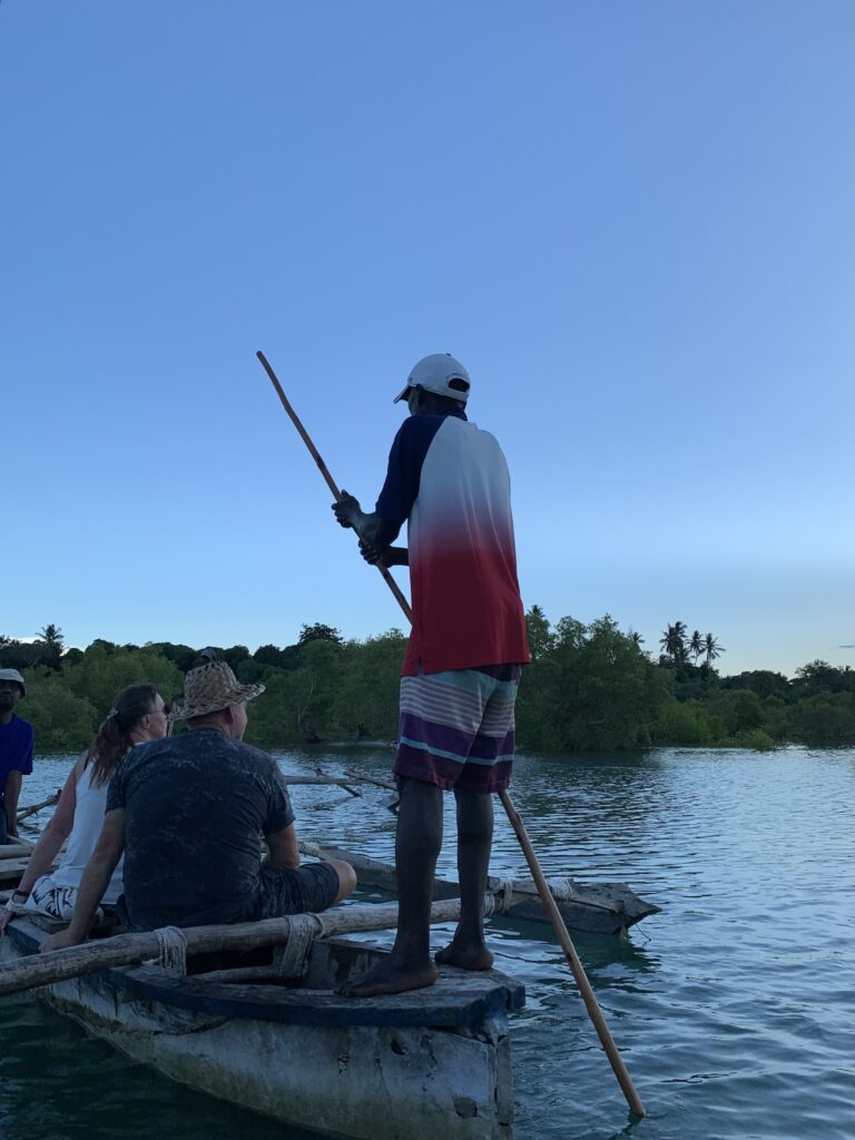 En kväll åkte vi med en kanot på Kongofloden, som mynnar ut i havet mellan Diani Beach och Tiwi Beach, för titta på solnedgången. Tyvärr drog det in några mindre lägligt placerade moln precis vid precis när de sista strålarna skulle försvinna bakom horisonten… Floden i sig var dock väldigt vacker, fylld av mangrove och baobab träd. Vår guide berättade glatt om hur tidvattnet var så högt att den yttre delen av floden bestod av saltvatten, och därför inte huserade varken krokodiler eller anakondor. Tack och lov kände jag, som precis insåg att floder i Afrika kan vara ganska mycket farligare än Helge Å hemma i Skåne.
